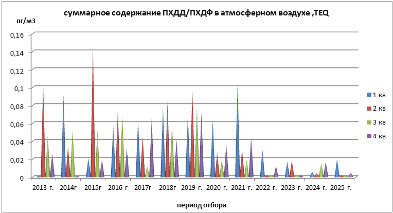 Содержание ПХДД/ПХДФ в атмосферном воздухе нормируется на территории РФ. Допустимый уровень суммарного содержания веществ этого класса (в «диоксиновом эквиваленте токсичности» составляет 0.5 х10-12 г/м3 ( 0.5 пг/м3)